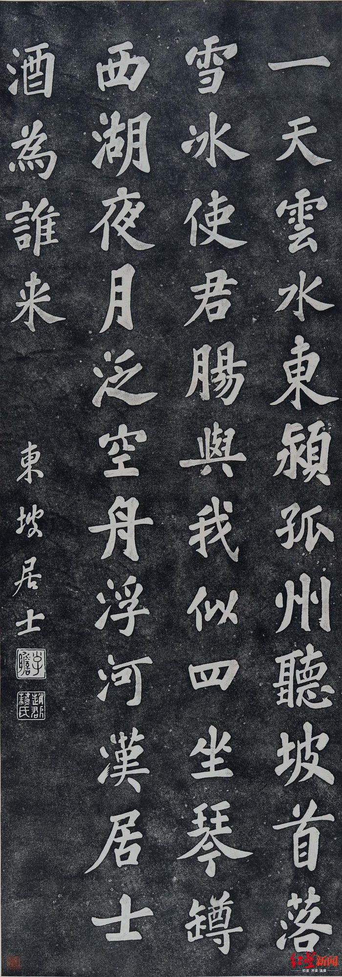 拓片内容为“一天云水,东颍孤州,听坡首落雪冰,使君肠与我似。 四座琴樽,西湖夜月,泛空舟浮河汉,居士酒为谁来。元祐四年二月六日,东坡居士”。