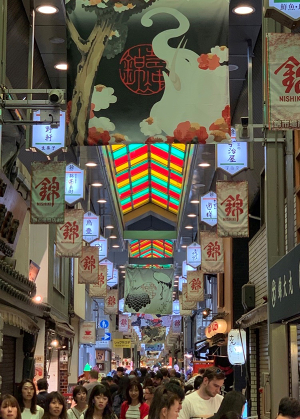 “锦市场”,京都历史最悠久的菜市场。位于京都闹市中心,东西走向,长390米,宽3至5米。汇集远近各地的时令蔬果和山珍海味,最受京都市民及各地各国游客青睐。图片由采访人拍摄。