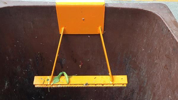 “神器”底部是一根黄色的锯齿,顶部通过锁扣拧紧在垃圾箱边沿。居民扔湿垃圾时,只需要把塑料袋放在锯齿上,轻轻往上拉,自动破袋。