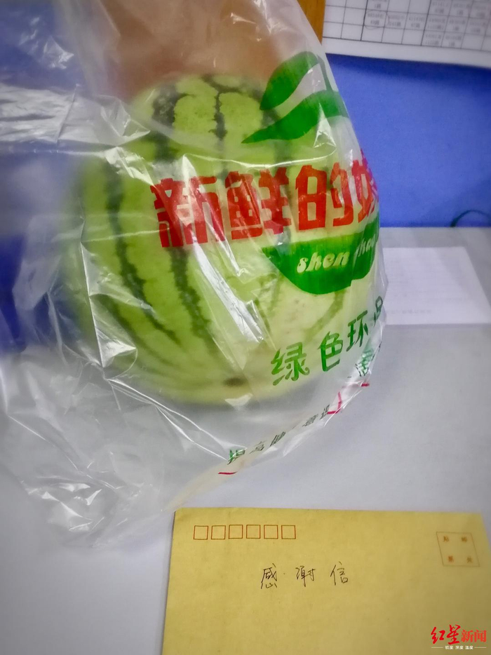 当天18时许,感受到公交师傅和陌生人温暖的女孩把一个西瓜和一封感谢信送到了位于昭觉寺公交站的49路调度室,要感谢李冰(兵)师傅。