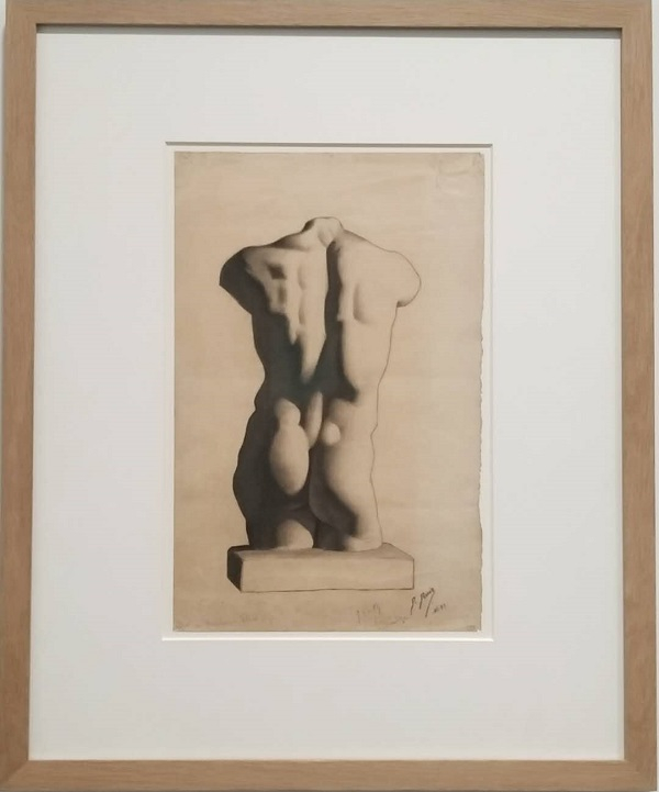《古典雕塑石膏像写生习作》是毕加索13岁时创作的作品,也是本次展览中年代最早的一件作品。这件写实素描的参照物是古希腊雕刻家菲迪亚斯所创作的一件躯干雕塑——大力神赫拉克勒斯。画中的赫拉克勒斯有着雕塑般的线条造型,运用木炭笔绘制出的巧妙阴影效果增加了一丝柔和感。这件作品创作于毕加索在拉科鲁尼亚美术学院就读期间。展示出他聪颖的天资和娴熟的绘画技巧。