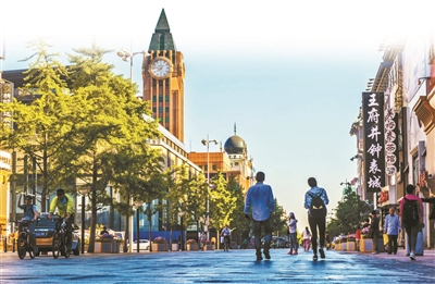 《规划》原文:王府井地区通过商业设施高度聚集,以满足国内外消费群体个体化、高端化消费需求为主,从现有步行街向南北两个方向延展,营造首尾精彩、序列壮美的步行街主街。从主街向东西拓展走向胡同和院落,营造层次丰富、细节精致的步行街辅街。