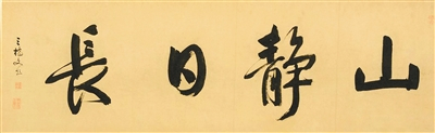 《山静日长图》合卷为纸本设色,纵约32厘米,横约143厘米,现藏于济南市博物馆。此卷引首处有文徵明长子文彭题行书“山静日长”,钤印“停云”,落款“三桥文彭”,款署钤印“文氏寿承”“两京国子博士”。手卷拖尾处有文徵明行书诗文35行,计335字,描写的是诗意的山林栖居生活。诗文开篇引宋人唐庚《醉眠》诗首句,借以抒发自己对世人追逐名利、我却独自清闲自在的感怀。文徵明行书深受元代赵孟頫影响,风格秀丽温润、气韵流畅,结字似欹却正、各具姿态,随心所欲又不逾法度;在用笔上,以中锋为主,笔画时断时连、有虚有实,虽变化多端却自然流畅。卷中画心部分为文徵明次子文嘉所绘《山静日长图》。此幅画面水墨苍润,设色淡丽,境界清旷,景色宜人。画面内容是按照其父行书部分的内容而创作,主要描画了父亲文徵明晚年致仕后,归隐山林的生活状态。