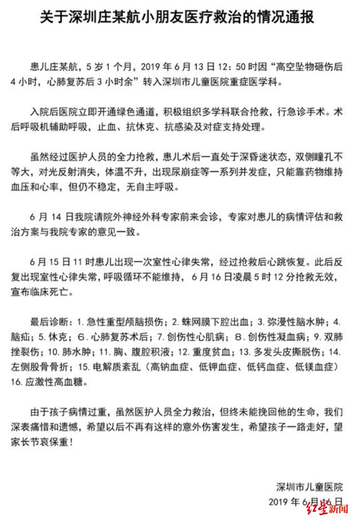经过多日抢救,6月16日凌晨5点12分,被20楼掉落的窗户砸中的深圳5岁男孩小宇航因伤势过重不幸离世。