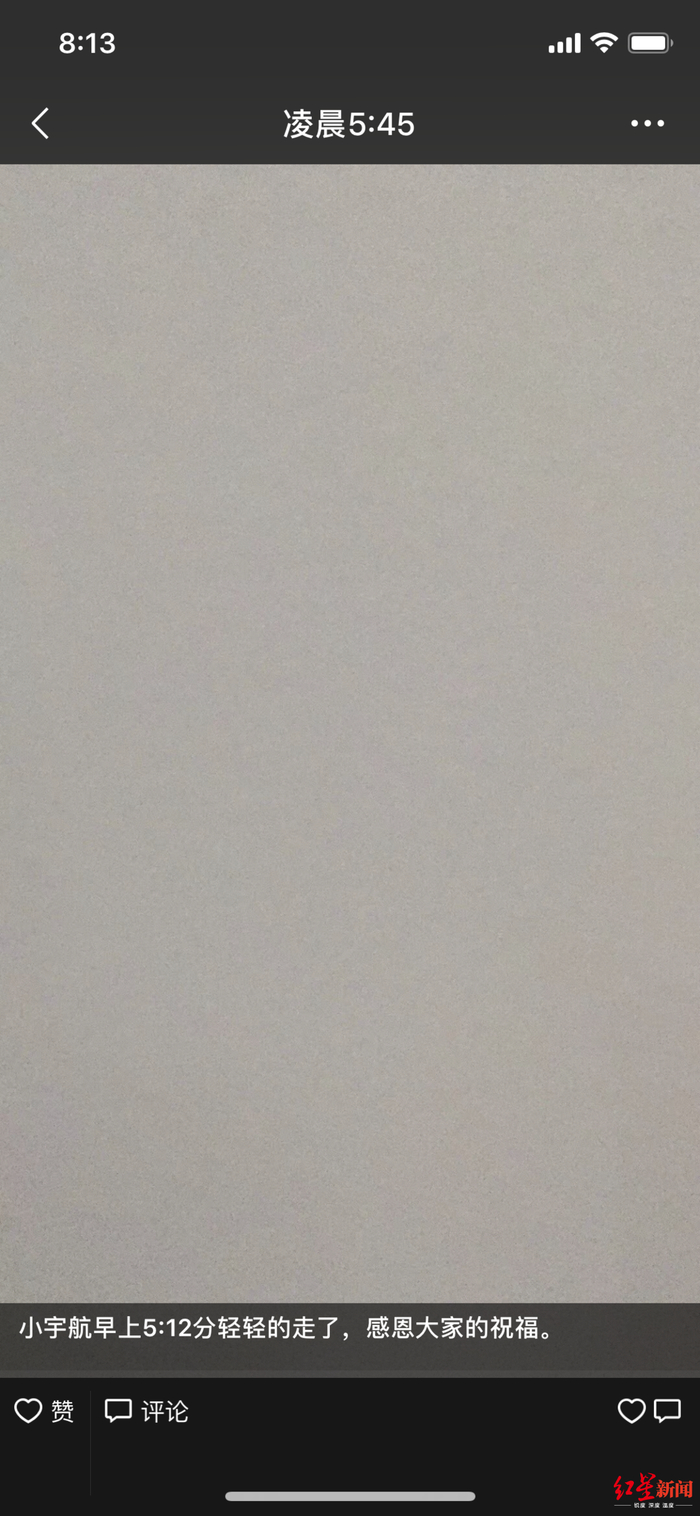 今日凌晨5点45分,小宇航的舅舅在朋友圈发布消息,“小宇航早上5:12分轻轻地走了,感恩大家的祝福。”