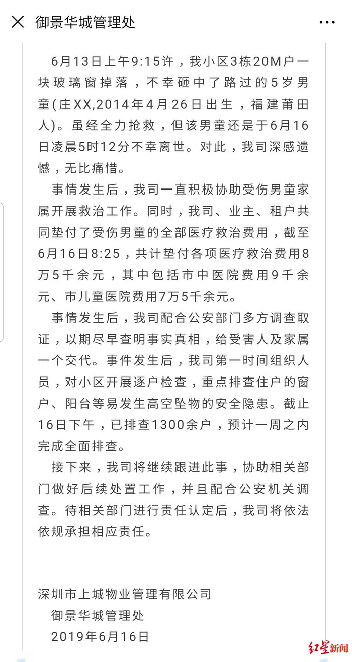 今日(16日)下午,事发小区物业深圳市上城物业管理有限公司御景华城管理处发布情况说明称,6月13日上午9:15许,该小区3栋20M户一块玻璃窗掉落,不幸砸中了路过的5岁男童(庄XX,2014年4月26日出生,福建莆田人)。虽经全力抢救,但该男童还是于6月16日凌晨5时12分不幸离世。对此,公司深感遗憾,无比痛惜。