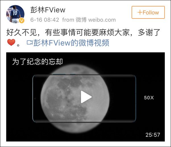 6月16日,彭林在微博宣布:他辞去了自己在北京爱否科技有限公司的职位,要以个人身份起诉华为,要求华为在涉及到月亮模式宣传的地方,都要注明用算法添加细节,且在手机内为用户增加提示。