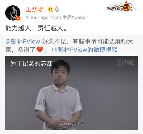 没想到,事情过去之后,6月16日,彭林又在微博宣布了自己辞职起诉华为的消息。而当天,曾被彭林开除的@王跃琨_ 还转发了彭林的这条微博,并写道:“能力越大、责任越大”,引发网友热议。