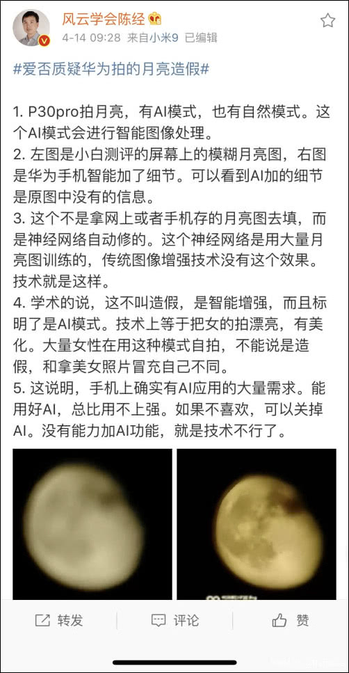 但另一头,这组照片却引起了国内评测机构爱否科技员工@王跃琨_的质疑。他在4月13日晚晒了两张对比图,称是自己分别用自动模式和手动模式拍的,照片中可以看到,自动模式下的月亮比手动多了好多东西……于是他认为“月亮好像真的是P上去的”,并推测手机会通过AI计算,自动处理照片细节。