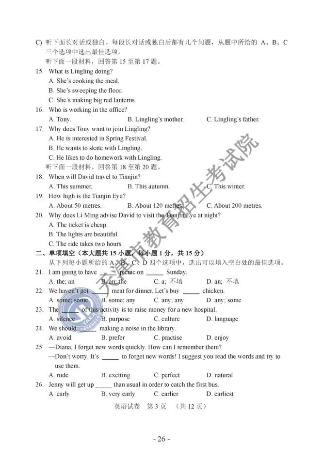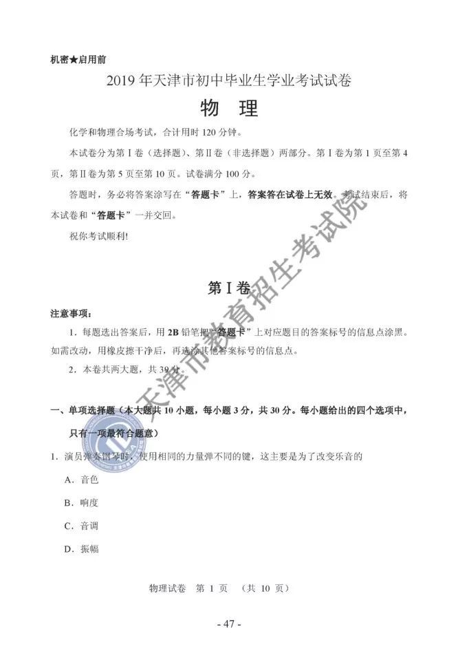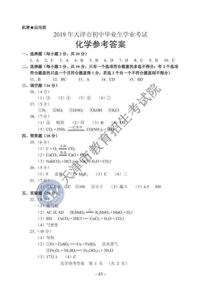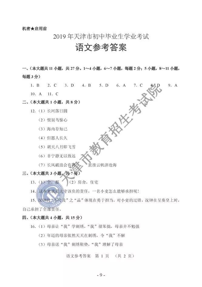 2019年天津市初中毕业生学业考试已于6月15日、16日顺利结束,现发布各科目试卷及参考答案,供参考使用。