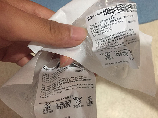 李先生提供的照片显示,两种人工鼻背后粘贴的产品说明完全一样。产品名称为“一次性湿热交换器”,型号规格、注册证编号、代理人名称、生产企业,甚至生产日期都一样。