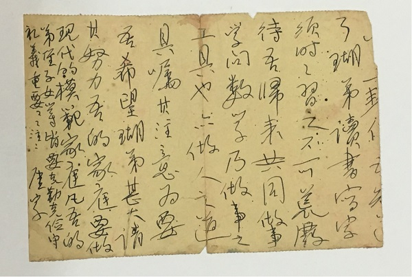 (释文)……□一封□吾知道了,瑚弟读书写字须时时习之,不可荒废,待我归来,共同做事,学问数学乃做事之工具也,亦做人之道具。嘱其注意为要,吾希望瑚弟甚大,请其努力,吾的家庭做现代模仿家庭,及吾的弟、侄、子女等皆要克勤克俭守礼仪,重要重要。厓字。(此前半页失落)