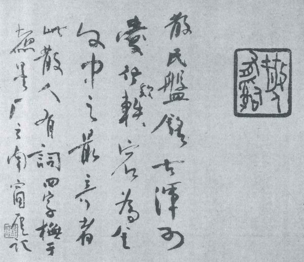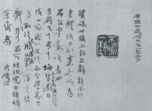 说明此事,西岛慎一先生在《风姿花传》中叙述,能够了解钱瘦铁人格的一段佳话:“战争结束后不久,有一位中国人访问了西川宁先生(中略)丈二和尚摸不清头脑的西川先生走到门口一看,原来是位旧相识—篆刻家钱瘦铁。钱先生草草打了个招呼,便拿出了用报纸包的一件包裹。‘这是槐安老先生离开上海时寄存在我这里的东西,如今他被开除公职,所以我把这幅托付给您’,钱先生说完从包裹里拿出了吴让之的《包世臣像》。(中路)所幸钱先生思虑周全,这件作品才回到了槐安老先生的手中,后来被收藏于东京国立博物馆。”文中提到的西川宁是现代日本书法界的领袖人物,和钱瘦铁一起被邀请《书菀》杂志的客座顾问。槐安老先生是日本著名的实业家、收藏家高岛菊次郎。从此中也能够窥见不分国界地对艺术真诚、把艺术作“和平运动”的钱瘦铁,更能看到他对艺术的自尊心。