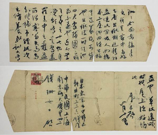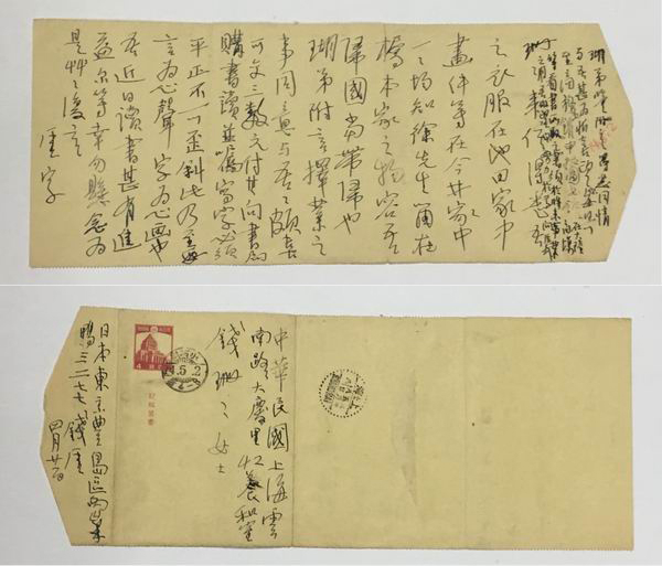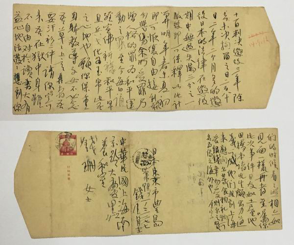 (释文)十一日判决惩役三年,除去未拘留之日二百八十日,二年二个月多的惩役,日本的法律在惩役期中无过失,满三分之一服役即可保释,以此计算明年春末夏初即可恢复自由。接到此信,幸勿悲伤。余所受罪乃增人格的罪,为和平运动之罪。至今每日诵经宣佛,祈祷和平,早息兵戈化为玉帛。此吾之心地也。愿你保重身体,教导子女,不必念吾。草草上言。再者吾要汗衫二件,请你寄来。吾在狱中身虽不自由,对于读书大有益。心地活泼泼,想到你们的时候,看看照相亦如见面一样。再者至嘱你此次事件,日友如土屋、池田、桥本诸先生颇出力。道义可感!他们或到上海来慰问尔等,食物礼物可受,银钱幸勿受,则尔之贤名当传之海外也!厓字