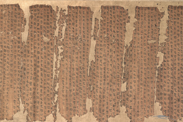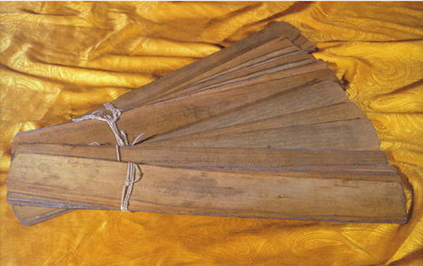 册叶书籍主要包含梵夹装、经折装、旋风装或曰龙鳞装、缝缀装、线装等诸多形态。梵夹装这种形式最早见于以梵文书写在贝多罗树叶上的古印度佛教经典,传入中国后,主要流行于隋唐时代的中原地区。梵夹装按顺序将写好文字内容的贝叶叠好,上下分别用一张板夹住,打孔穿绳。另外,梵夹装不是写上去,而是刻上去,用带有针的笔刻上去,刻完之后,沾上红油或黑油涂抹,从笔尖划开的地方渗入,就成了红字或黑字。