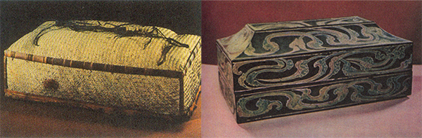 竹筒和漆木箱:帛书既可以有卷轴卷束,也可以折叠后放在装具中。常见的装具有竹笥(即竹篾编织而成的小盒子)和漆木盒。
