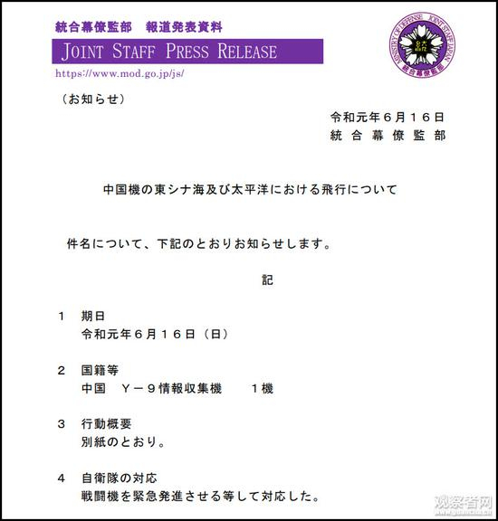 在进入西太平洋空域后,运-9情报收集机还调转航行在那霸东南部空域进行了往返飞行。随后,再次经宫古海峡从西太平洋空域返回东海上空。日本统合幕僚监部紧急派出战斗机进行是识别和监视,还拍摄到了运-9情报收集机的飞行画面。