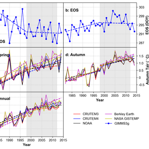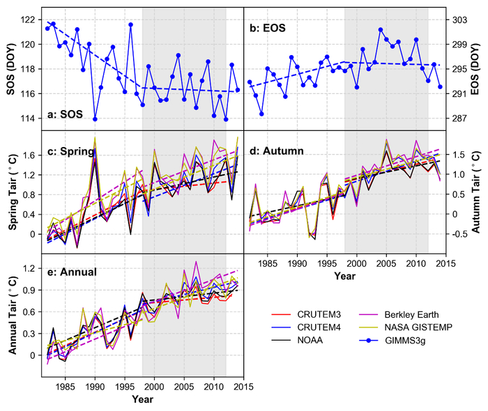 图:1982年至2014年期间北半球(纬度≥30°)物候期和温度的变化趋势。a是采用遥感估算的生长季开始时间(SOS)的变化趋势;b是采用遥感估算的生长季结束时间(EOS)的变化趋势;c是北半球春季平均温度的变化趋势;d是北半球秋季平均温度的变化趋势; e全球陆地平均温度变化趋势。遥感物候估算采用了五种常用的物候估算模型,图a和b中是五种模型的平均值。温度数据选取了五套IPCC报告中用于评价全球变暖的数据集,分别是CRUTEM3.0、CRUTEM4.6、NOAA、 Berkley Earth和 NASA GISTEMP。图中虚线表示采用Mann–Kendall方法计算的线性趋势。图中灰色阴影部分表示Warming Hiatus时段。