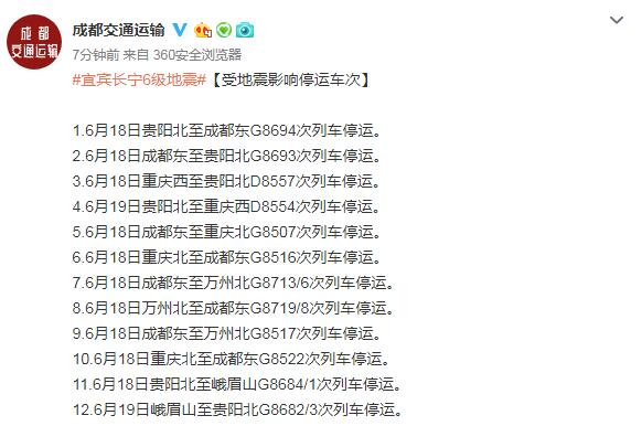 中国网6月18日讯 据成都市交通运输局官方微博“成都交通运输”消息,受四川宜宾长宁6级地震影响,总计104车次列车确认停运。