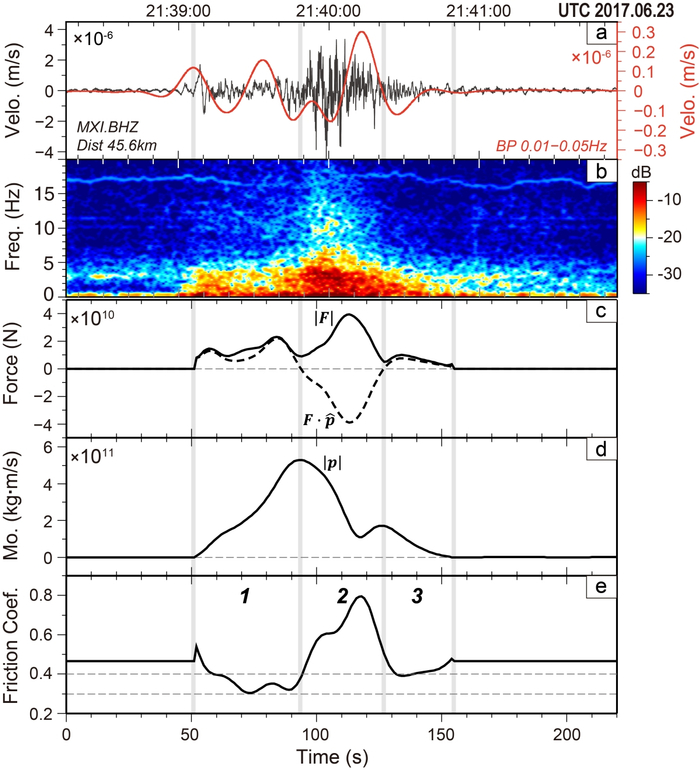 图2 新磨滑坡地震信号特征(a-b)、滑坡体对地面作用力(c)、滑坡体绝对动量(d)和滑坡面视摩擦系数(e)随时间的变化特征