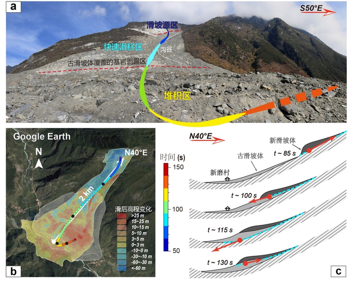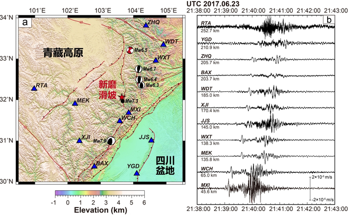 北京时间2017年6月24日5时39分,四川省茂县叠溪镇新磨村后山的山体发生了顺层高位滑坡,滑坡体积达约4.5×105 m3,造成10 人死亡、73 人失踪,整个村庄几乎全被埋没,引起国内外的广泛关注(图1a)。针对此次灾难性大滑坡,国内外学术界开展了大量研究并发表了一批工程地质和灾害防治方面的论文,但缺乏详细的动态过程参数方面的制约。中国科学院地质与地球物理研究所岩石圈演化国家重点实验室壳幔结构探测学科组博士后李玮和合作导师、副研究员陈赟等人,基于国家地震台网固定台站的波形数据(图1),利用长周期地震信号分析和波形反演,重建了该次灾难性滑坡的加速、减速和堆积三阶段动态过程(持续时长为104 s)。通过与实际滑移距离的拟合,推断滑坡体质量为9×109 kg,最大滑移速度和加速度分别为58.8 m/s 和4.38 m/s2。