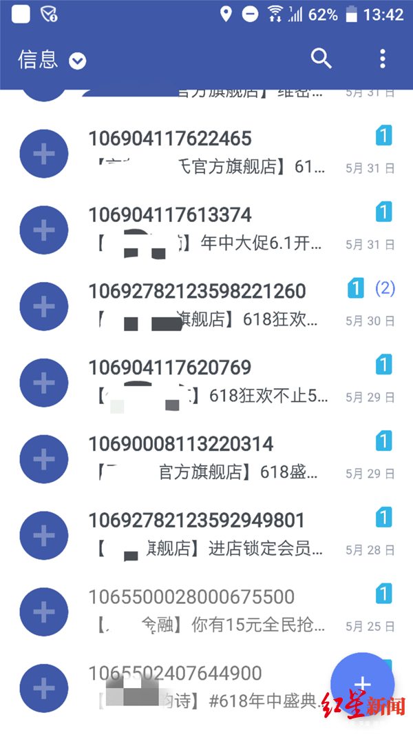 不数不知道,一数吓一跳。结果显示:何先生618购物节前一个月就开始接收到各大电商平台电商们的促销短信,持续1个月,总共接收到56条,加上手机安全软件自动拦截的促销短信,共计两百余条。尤其是在17日至18日凌晨,各类促销短信更是爆发式出现。“垃圾信息不断发来,重要的信息在角落察觉不到,比如有条交管局的违章信息,我就没注意到,这十分影响生活。”何先生抱怨。