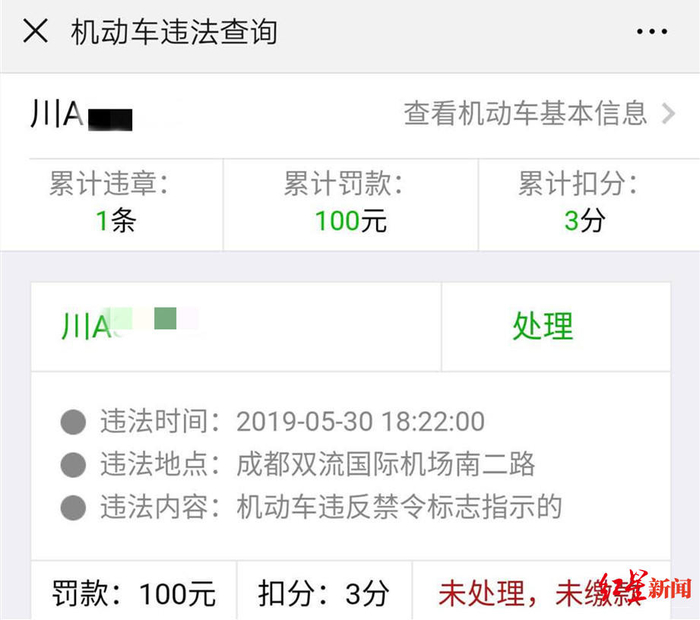 5月30日下午6点18分,王师傅接到一名乘客拼车订单,乘车地址位于成都双流国际机场外的机场南二路。很快,王先生根据平台自带导航开车驾驶到乘客指定地点接客,在路边等了三四分钟接上乘客后前往目的地。没想到,几天后王师傅便收到了交通违法罚单的通知,因机动车违反禁令标志指示被交管部门罚款100元,记3分,这时王师傅才知道原来该条道路禁止停车。