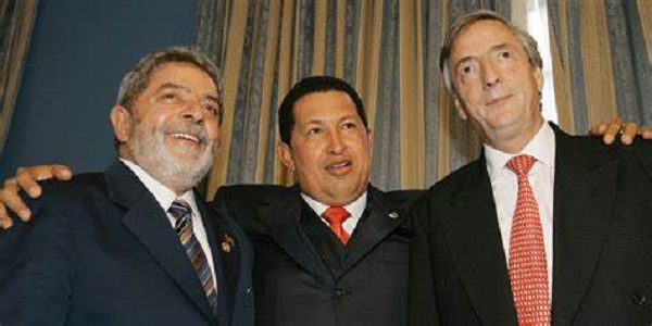 新民众主义(粉色浪潮)主要领导人。从左到右:时任巴西总统卢拉、委瑞内拉总统查韦斯、阿根廷总统基什内尔
