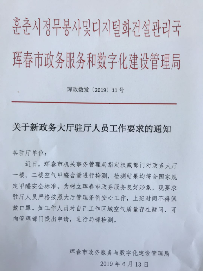 6月13日,珲政数字化局向入驻新政务大厅的各单位发通知,称甲醛检测达标,要求工作人员上班时间不得佩戴口罩。
