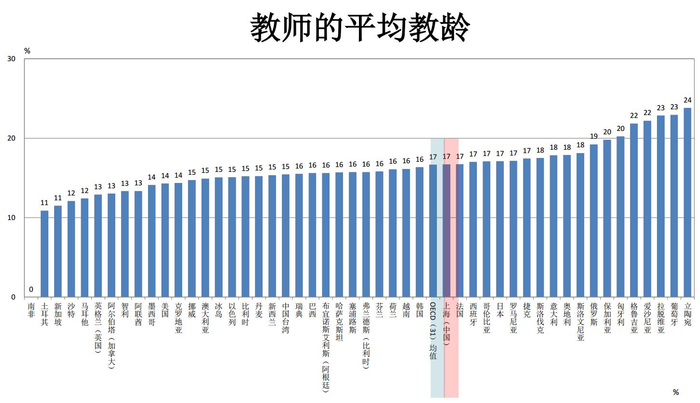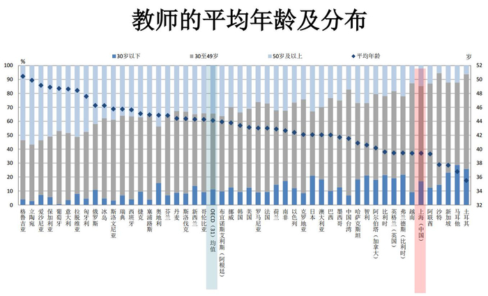 调查结果显示,上海初中教师平均年龄为39.4岁,比OECD教师平均年轻4.7岁。作为已步入老龄化社会的上海,教师平均年龄仅比沙特、新加坡、马耳他、土耳其的平均年龄大,显示出教师队伍特有的优势。