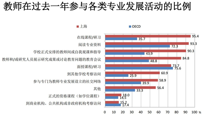 调查结果显示,上海有95.5%的校长表示学校会为新教师提供正式入职培训,与英格兰、新加坡同属提供此类活动比例最高的教育系统。同时,上海有83.1%的教师报告参加过正式入职培训,是所有国家(地区)中比例最高的。