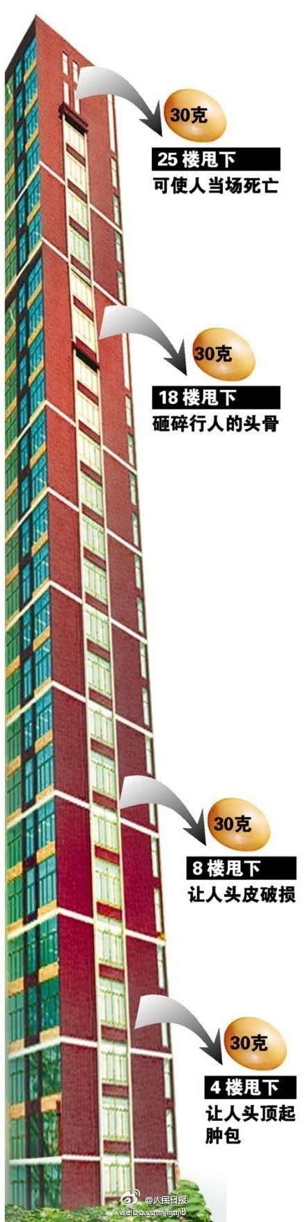 根据相关测算,一枚重30克的鸡蛋从4楼抛下,会把人头顶砸出肿包;而从18楼抛下,能砸破头骨;如果从25楼抛下,冲击力足以致人死亡。所以别小看一枚鸡蛋,如果从高空落下,威力不亚于炸弹!