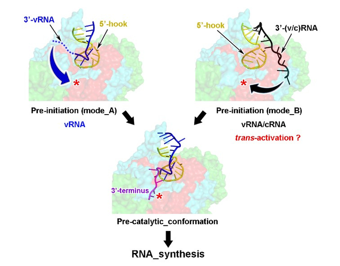图2. 流感病毒聚合酶合成RNA起始阶段的工作模型