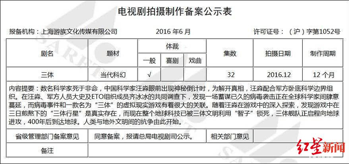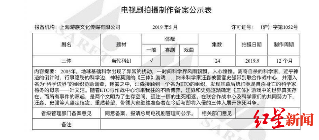 红星新闻记者发现,剧版《三体》并不是第一次报备。早在2016年《三体》曾出现在备案信息中,集数比这次要多上8集,报备机构同样是游族影业。知情人士透露,影视改编权都有时间性,如今已经过了快10年,《三体》的改编权已经要过期,所以游族影业比较着急,所以才再次报备拍摄。