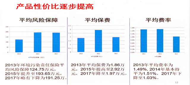 对各地上报数据的进一步分析发现,风险保障在不断提升,而平均保费、平均费率都在降低。2013年环境污染责任保险平均风险保障为124.75万元,2015年提升至193.65万元,2017年略有下降为191.25万元;2013年平均保费为1.86万元,2015年提高至2.92万元,2017年降至1.97万元;2013年平均费率为1.49%,2014年基本持平为1.51%,2017年下降至1.03%。