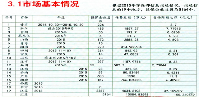 李萱称,根据2015年原环境保护部信息报送情况,报送信息的19个地方,投保企业总数为5164个,保费总额15084.84万元,责任限额总额100.24亿元。“市场规模表现出较强的政策性。”她说。
