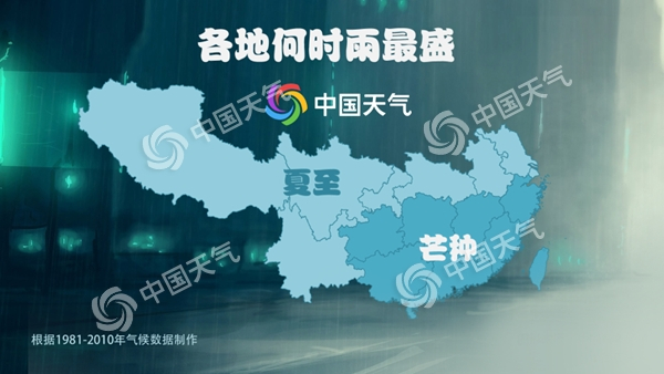 “夏至落雨十八落,一天要落七八砣”。从气候背景来看,夏至节气是西藏、云南、四川、重庆、湖北、安徽、江苏、上海一带一年中降水最多的节气。通常夏至期间,或者说6月下旬至7月上旬,一般是长江中下游地区降水最丰沛的时期,恰逢梅子成熟,当地称之为梅雨,雨带会在江淮到江南一带摆动。