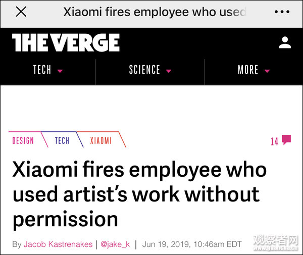 最初报道“抄袭事件”的《The Verge》今天也公布了后续进展,称19日小米公司一官方发言人对其回复邮件,承认抄袭并解雇涉事设计师。