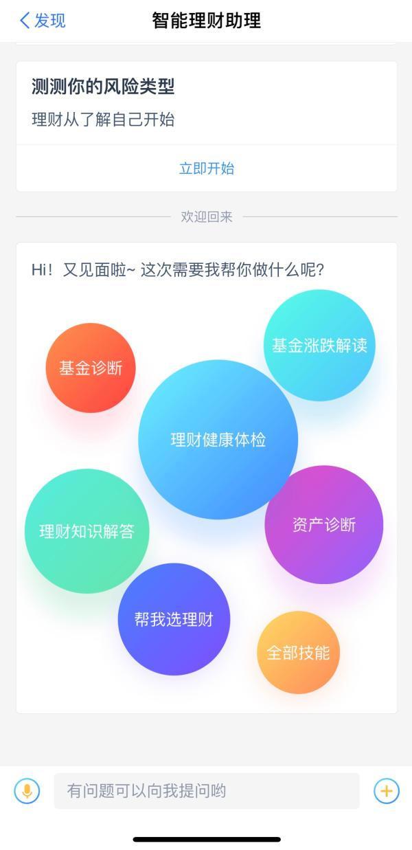 蚂蚁金服数字金融线总裁黄浩在2019蚂蚁金服财富伙伴大会上介绍称,用户通过智能理财助理的入口,可以随时对自己的理财行为进行评估,了解持仓风险,学习理财知识,获得个性定制配置策略等等。