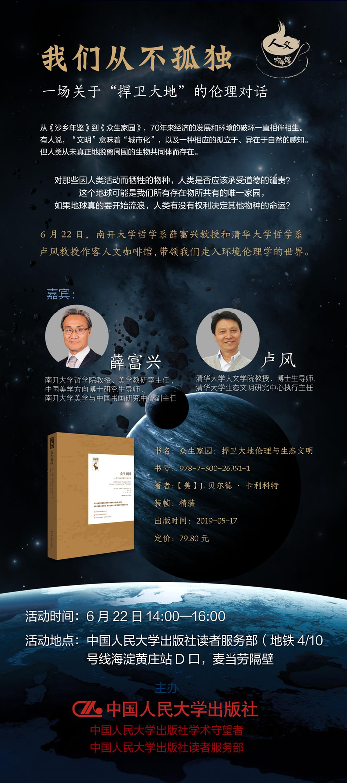 从《沙乡年鉴》到《众生家园》,70年来经济的发展和环境的破坏一直相伴相生。有人说,“文明”意味着“城市化”,以及一种相应的孤立于、异在于自然的感知。但人类从未真正地脱离周围的生物共同体而存在。对那些因人类活动而牺牲的物种,人类是否应该承受道德的谴责?这个地球可能是我们所有存在物所共有的唯一家园,如果地球真的要开始流浪,人类有没有权力决定其他物种的命运?6月22日,南开大学哲学系薛富兴教授和清华大学哲学系卢风教授做客人文咖啡馆,带领我们走入环境伦理学的世界。