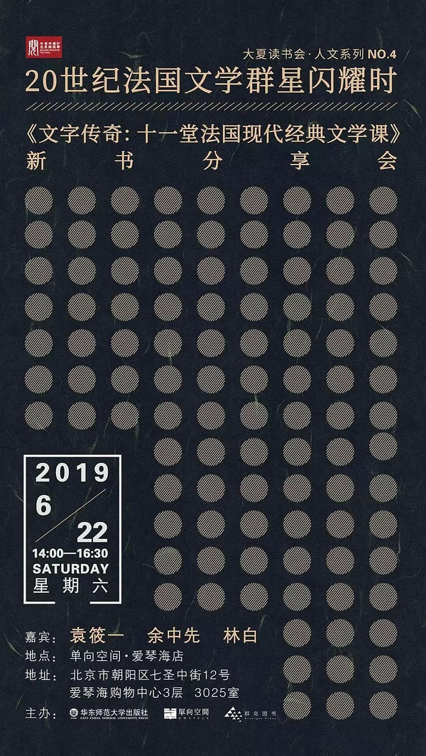 6月22日下午,法语翻译家、傅雷翻译出版奖得主袁筱一携新书《文字传奇:十一堂法国现代经典文学课》做客单向空间·爱琴海店,与中国社科院教授、《世界文学》前主编余中先,著名作家林白,群岛图书出版人彭伦畅谈现代法国文学的世纪变幻。欢迎各位读者来到现场,参与这一堂别开生面的“法国文学课”。