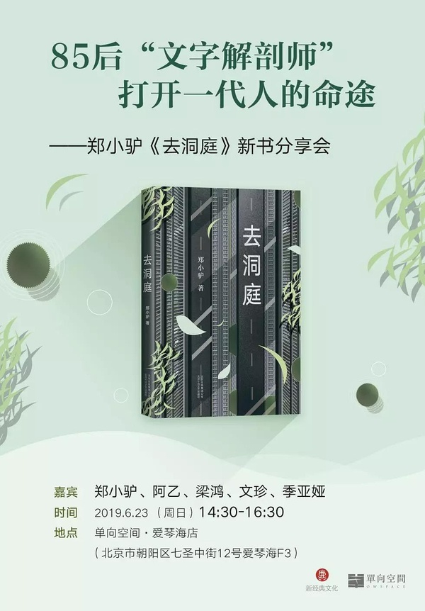 6月23日下午,当代实力派作家郑小驴携其新作《去洞庭》做客单向空间·爱琴海书店,与读者聊聊“85后”作家的写作经验,以及时代对这一代人命运的影响。主办方还邀请到著名作家阿乙、中国人民大学文学院教授梁鸿、青年作家文珍、文学评论家季亚娅一起与郑小驴畅谈文学。欢迎各位读者来现场,与名家一起交流,共同感受文学之美。