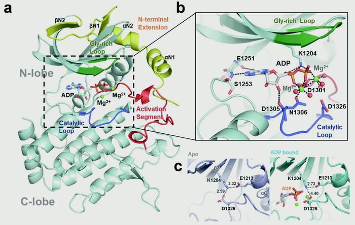 细胞是生命活动的最小单元,细胞器是真核细胞执行复杂生命活动调控的“工作室”。细胞器分为膜性细胞器与无膜细胞器。着丝粒是一个典型的无膜细胞器,其在细胞有丝分裂过程中扮演不可缺少的作用,其组装与功能异常导致染色体丢失、易位等,从而使细胞生长失控,如癌症。美国Bert Vogelstein团队在20世纪90年代发现了着丝粒BubR1基因突变对直肠癌基因组不稳定性的影响。此后, BubR1基因突变增加胃癌易感性的案例也相继报道。针对BubR1是否是蛋白激酶这一关键科学问题及其构-效关联的生物学意义,中国科大姚雪彪、滕脉坤、臧建业、刘行与生化与细胞所张荣光合作团队精诚合作,从2012年开始联手对有丝分裂重要蛋白激酶BubR1进行结构生物学研究。经过对多个物种BubR1蛋白在不同条件下的筛选与优化,成功地解析了果蝇BubR1蛋白的晶体结构(如图)。从X-线衍射数据分析得到的卡通模型结构表示:BubR1具有蛋白激酶的经典特征:一系列反平行β-折叠和一个α-螺旋形成的N端lobe;一个主要由螺旋结构组成的C端lobe。从晶体结构中研究人员分析得出两个lobe之间有个ATP的结合口袋。从激酶与构效研究结果提示,Lys1204、Asp1326和Ser1253这三个位点可与ATP形成氢键,对于稳定ATP与BubR1激酶区域结合口袋的结合非常重要,是BubR1催化底物磷酸化的结构基础(如图)。