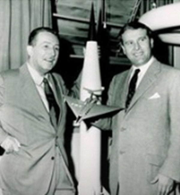 上面这张照片上的两个人,右边的这位是“火箭之父”冯·布劳恩,此人经历传奇,既制造过德国纳粹的V2火箭,又设计过美国政府的登月火箭;而左边的这位,正是迪士尼公司的创立者华特·迪士尼(Walt Disney)本尊,正是他,让“迪士尼”变成了很可能是全球最知名的一个姓氏。
