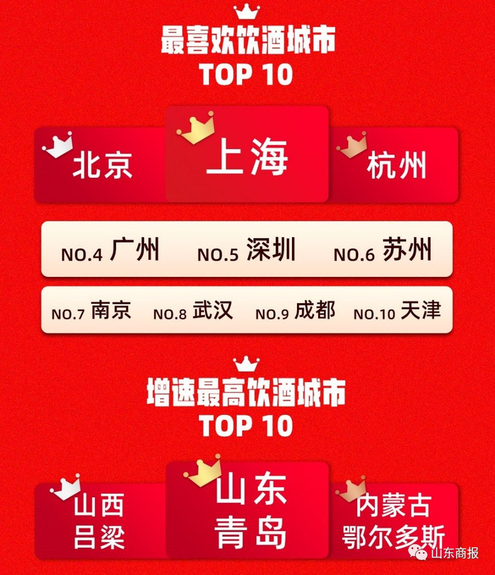 战报显示,上海、北京、杭州位列“最喜欢饮酒城市”前三席。而增速最高饮酒城市则被青岛夺得。