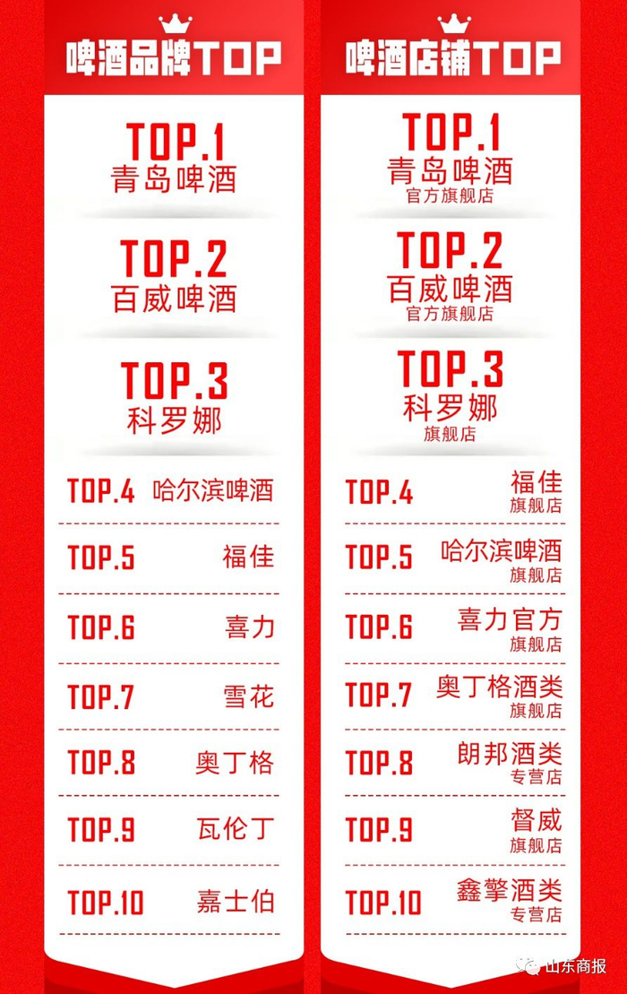 在啤酒品牌TOP10榜单、啤酒店铺TOP10榜单中,青岛啤酒均位列第一。