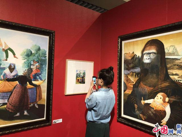 安东尼·布朗的许多画作灵感源于世界名画。图为观众参观展览。 中国网记者 苏向东/摄
