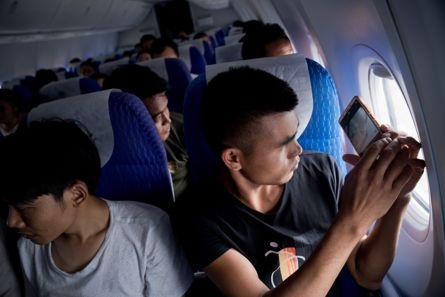 ▲孤儿咖农言秀邓一上飞机就不停地用手机拍视频