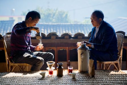▲初夏,和风徐徐,施忠相(左)和父亲在阁楼上对饮。为培养当地的咖啡文化,当地要求各级政府部门和基层组织都要求学会喝咖啡,讲咖啡,如施忠相一样的年轻人对时尚的咖啡文化自然亲近,这也是丛岗咖啡产业升级和认识转变的文化基础