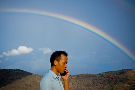 ▲一道彩虹挂在村前,丛岗村的大学生村官施忠相电话联系上海的同学,落实带咖农们去上海喝杯咖啡的计划。潞江镇是小粒咖啡原产地、有六十多年的历史。在大学生村官施忠相看来:“这次拼多多驻村参与进丛岗的发展是我们最大的机会,如果没抓住,只有眼看着村民们把自己的咖啡树都砍了”